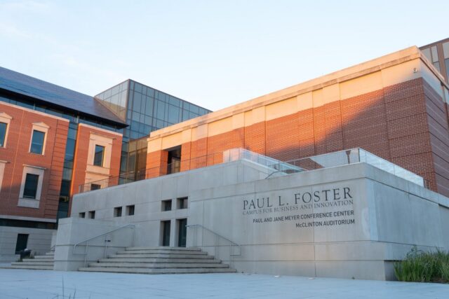 Quade explains how the core values of the business school — community, humility, excellence and stewardship are embedded within the culture and community present inside the Paul L. Foster Center Campus for Business and Innovation.