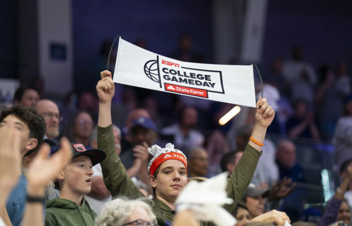 A TCU fan shows off his College GameDay banner after TCU Basketball hosted ESPN's College GameDay for the first time during the TCU-Baylor Women's Basketball game on Sunday evening at Schollmaier Arena in Fort Worth. Jake Schroeder | Photographer