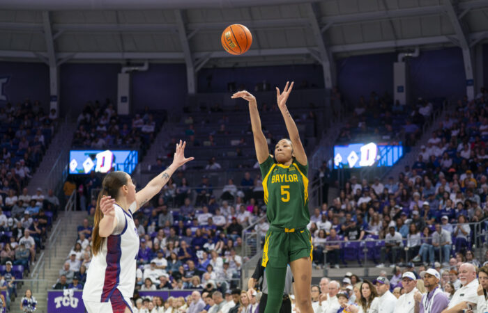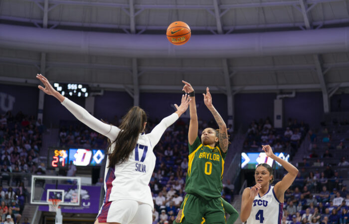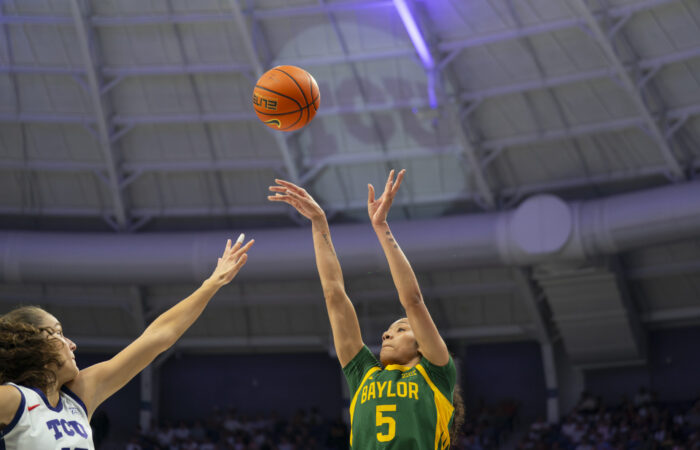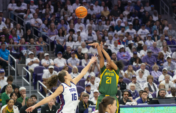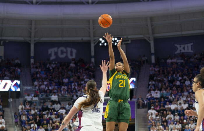 Senior wing Darianna Littlepage-Buggs fires up a three during the Bears' 65-53 loss on Sunday evening against TCU at Schollmaier Arena in Fort Worth. Jake Schroeder | Photographer