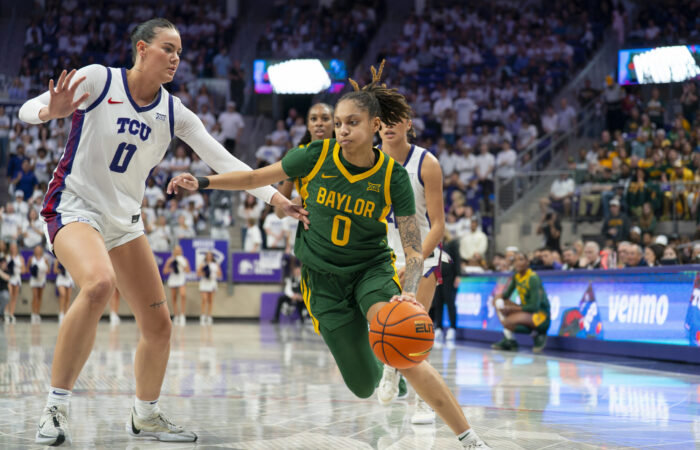 Redshirt Sophomore guard Taliah Scott drives toward the basket past TCU's Senior center Kennedy Basham during the Bears' 65-53 loss on Sunday evening against TCU at Schollmaier Arena in Fort Worth. Jake Schroeder | Photographer