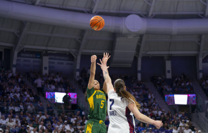 Senior wing Darianna Littlepage-Buggs fires off a three over TCU's Graduate forward Marta Suarez during the Bears' 65-53 loss on Sunday evening against TCU at Schollmaier Arena in Fort Worth. Jake Schroeder | Photographer
