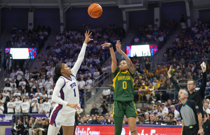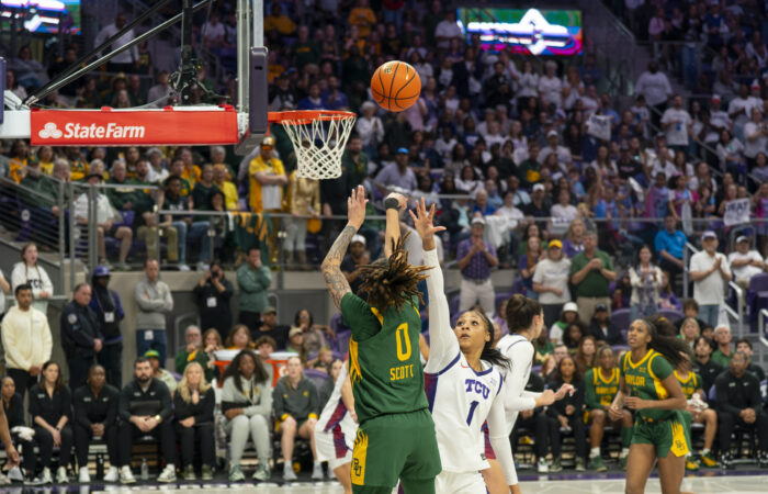 Redshirt Sophomore guard Taliah Scott fires a three over TCU's Redshirt Senior guard Taylor Bigby during the Bears' 65-53 loss on Sunday evening against TCU at Schollmaier Arena in Fort Worth. Jake Schroeder | Photographer