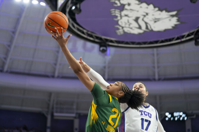Senior wing Darianna Littlepage-Buggs throws up a shot over her defender during the Bears' 65-53 loss on Sunday evening against TCU at Schollmaier Arena in Fort Worth. Jake Schroeder | Photographer
