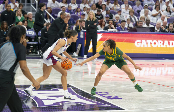 Freshman guard Marcayla Johnson puts pressure on TCU's Junior guard Donovyn Hunter as she brings the ball up the court during the Bears' 65-53 loss on Sunday evening against TCU at Schollmaier Arena in Fort Worth. Jake Schroeder | Photographer
