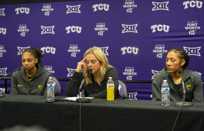Redshirt Sophomore guard Taliah Scott, Head basketball coach Nicki Collen, and Senior wing Darianna Littlepage-Buggs reflect on the Bears' 65-53 loss on Sunday evening against TCU at Schollmaier Arena in Fort Worth. Jake Schroeder | Photographer