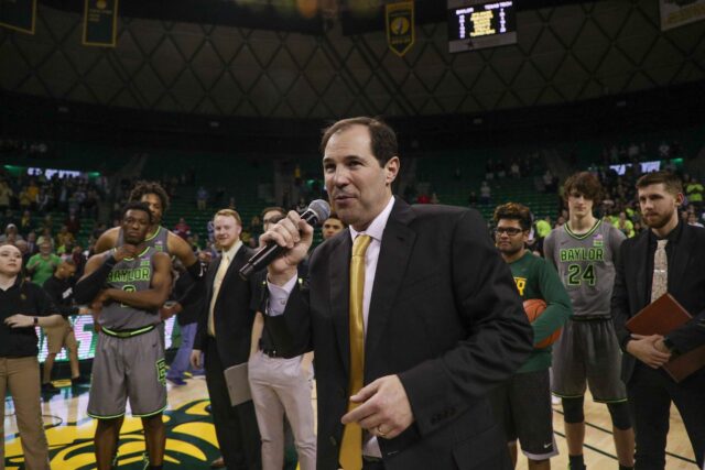 Baylor basketball head coach Scott Drew gives a speech during Senior Night at the Ferrell Center. Lariat file photo