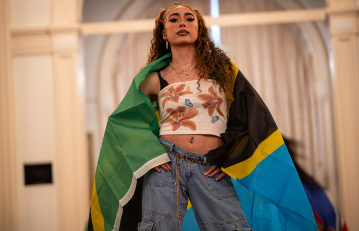 A student model shows off her heritage with a Tanzanian flag at the Afrique event at the Sub on Friday night. Caleb Garcia | Photographer