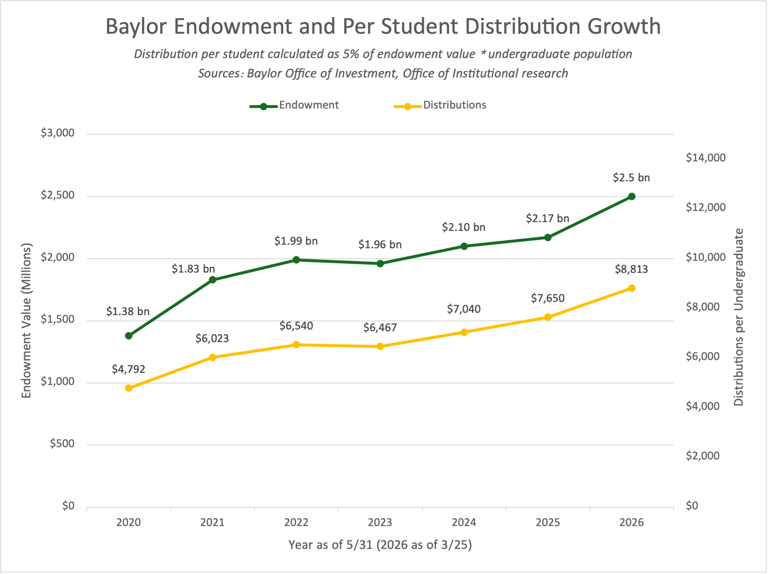As of Wednesday, Morehead said he expected the endowment to end the month near $2.5 billion, up from $2.4 billion at the end of September and a further increase from its $2.17 billion balance in May 2025. The endowment contributes 5% of its value back to Baylor each year, so each dollar the endowment makes puts five cents into Baylor’s operating budget.