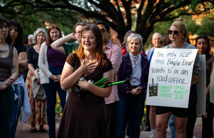 Waco junior Joanna Able leads in a moment of reflection during the All Are Neighbors prayer vigil Wednesday evening. Sam Gassaway | Photo Editor