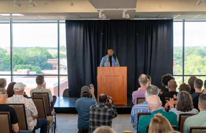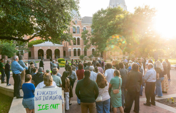 Students, faculty and community members share their stories in Burleson Quad Wednesday night. Mesha Mittanasala | Photographer