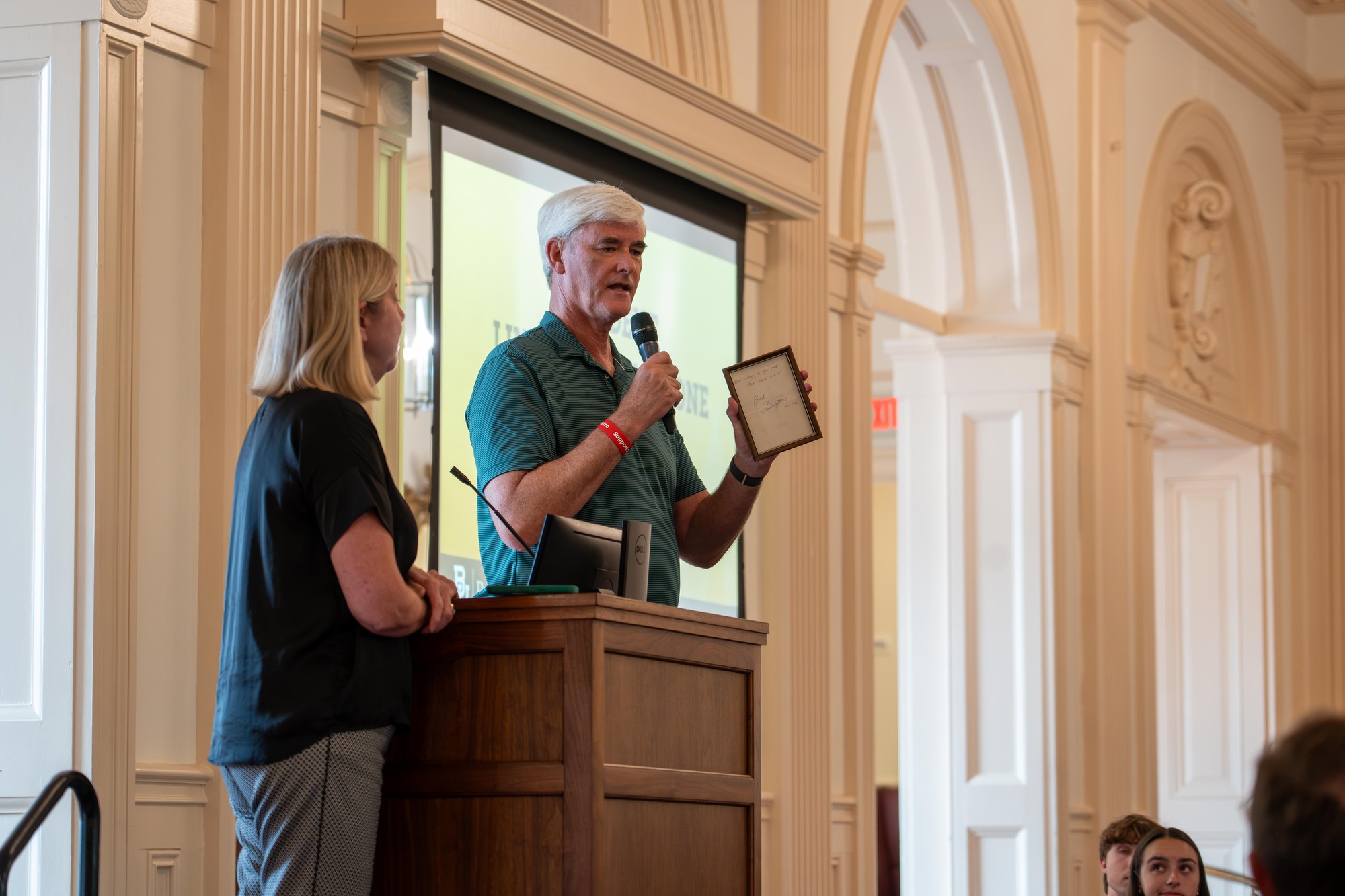 First gent Brad Livingstone shares a letter he wrote as a camp counselor, encouraging students during the Camp Staff Commissioning Ceremony at the SUB on Monday. Sam Gassaway | Photo Editor